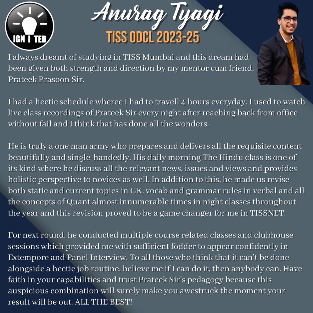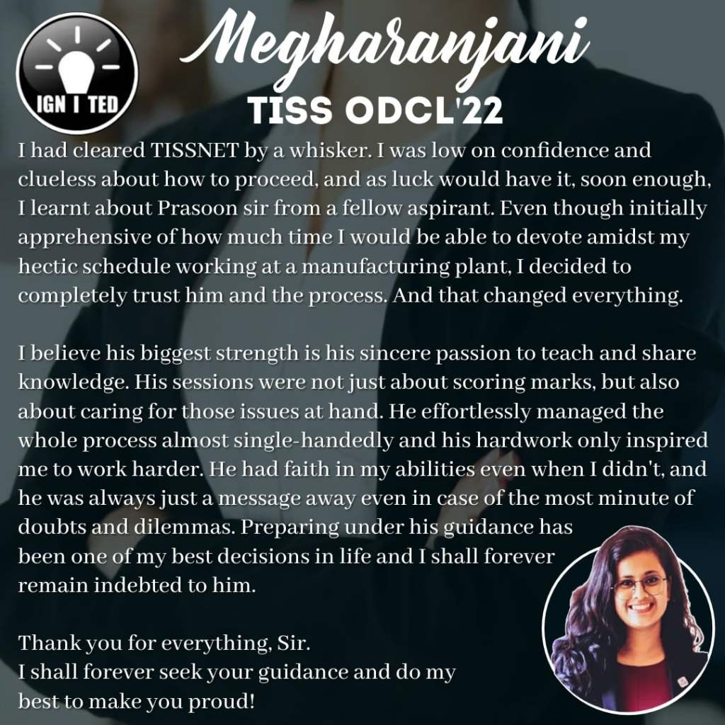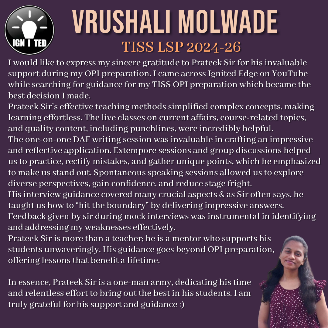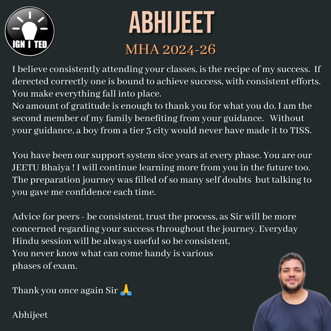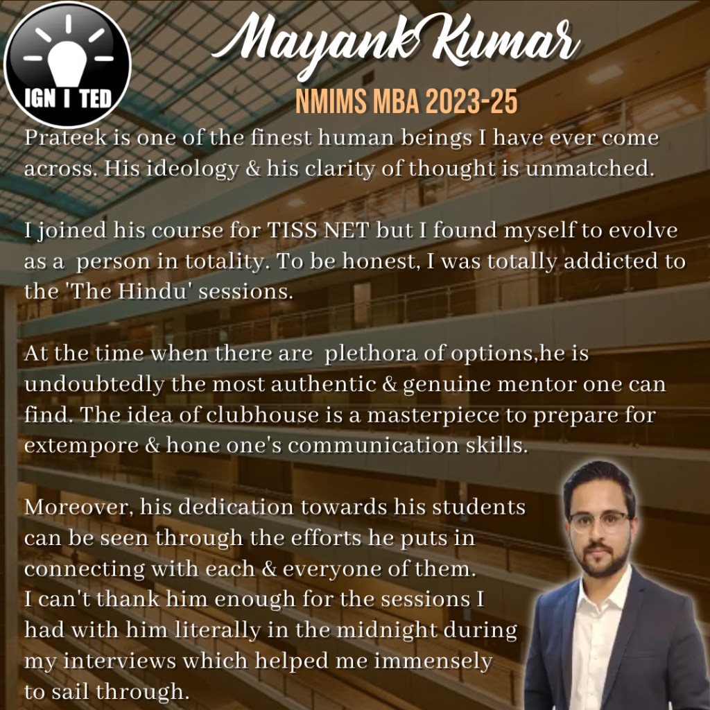 In past 3 years he has mentored, taught and guided more than 1000 students giving excellent results. He provides guidance for UPSC, PCS, TISS, XAT and OMETs.
